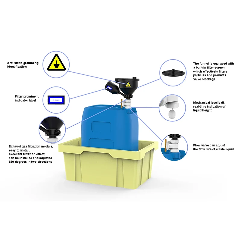 Jätenesteen keräyslaitteella on huomattavat ominaisuudet. Sen keräysastia on valmistettu tuoduista antistaattisista PP-raaka-aineista, mikä ei ainoastaan takaa materiaalin stabiilisuutta, vaan toimii tehokkaasti myös antistaattisena aineena, joka ohjaa jätenesteen suppilon staattista sähköä alueella 10^5 - 10^9, mikä vähentää huomattavasti staattisen sähkön aiheuttamien katastrofien riskiä. Suppilossa on hienostunut muotoilu. Vuototiiviiseen yläkanteen on yhdistetty tiivistekansi ja roiskesuojattu suodatinsuppilo, ja venttiili voidaan asentaa tarpeen mukaan varmistamaan jätenesteen varastoinnin turvallisuus. Vastapainotyyppinen yläkansi säätää pakokaasupäästöjä automaattisesti sisäisten paineolosuhteiden mukaan, jolloin avautuu 100 Pa:lla ja sulkeutuu 50 Pa:lla, välttäen räjähdyksen ja itsestään syttymisen. Pakokaasusuodatin on kytketty spiraalimaisesti, mikä on kätevä vaihtaa ja estää kemiallisten komponenttien haihtumisen. Saatavilla on 5 eri tyyppiä, jotka sopivat tarkasti erilaisiin pakokaasukäsittelyihin.